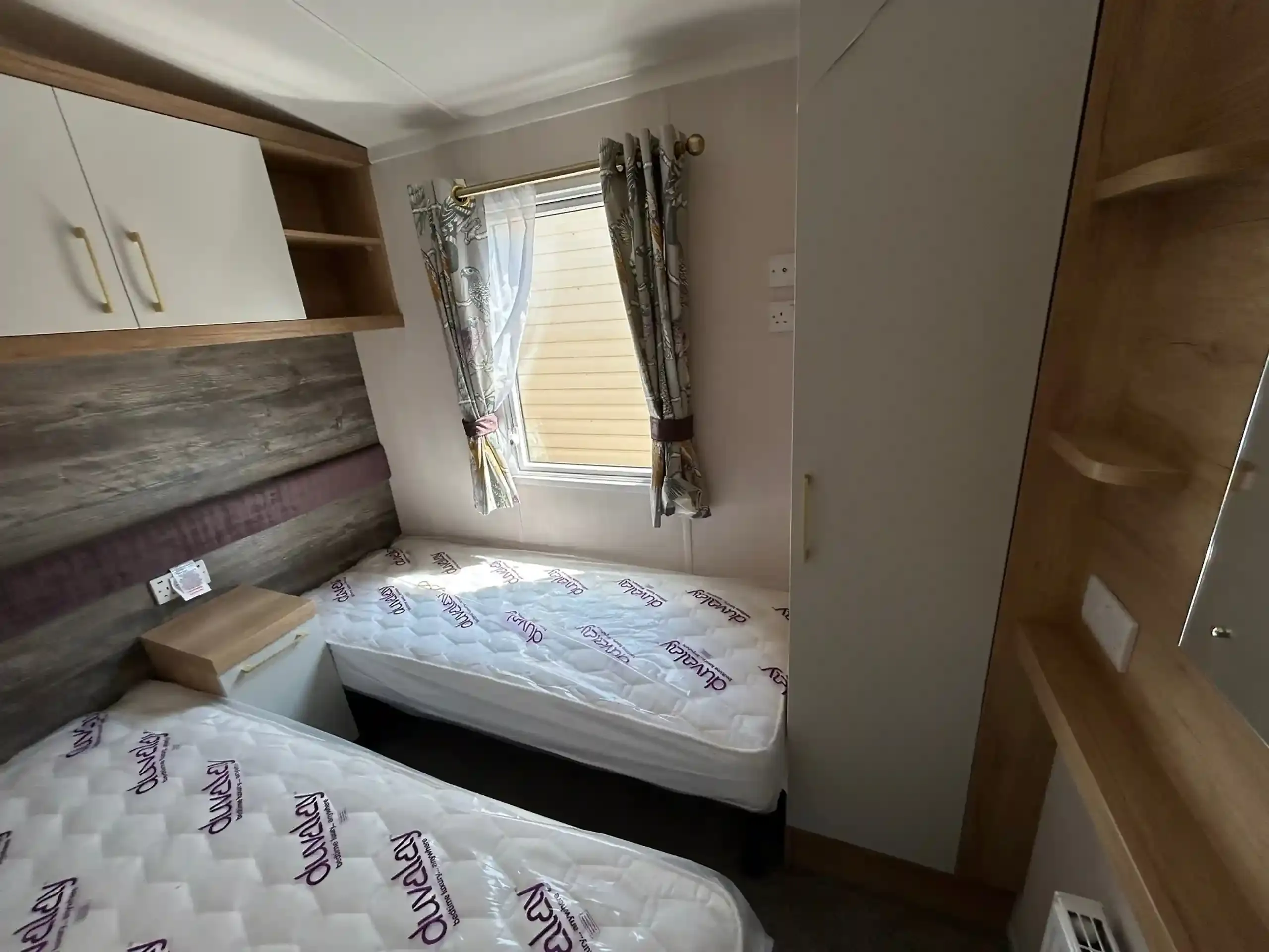 Both bedrooms are spacious yet cosy, with the master having a double bed that lifts up for extra storage, and an en-suite toilet. The second bedroom contains two singles. Both rooms have built in wardrobe space and bedside tables. Other features throughout the caravan include USB ports, low level LED lighting and luxury carpets.